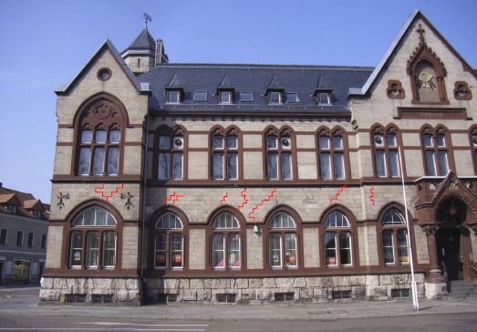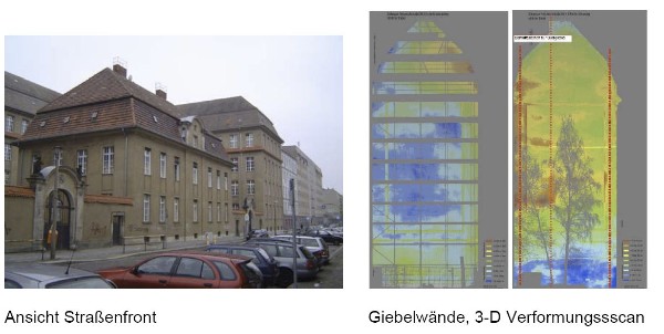 Substanzuntersuchungen, Schadensanalyse und Sanierung der Giebelwände auf Grundlage von 3D- Verformungsscans, Schadensanalyse und Sanierung der WC- Bereiche